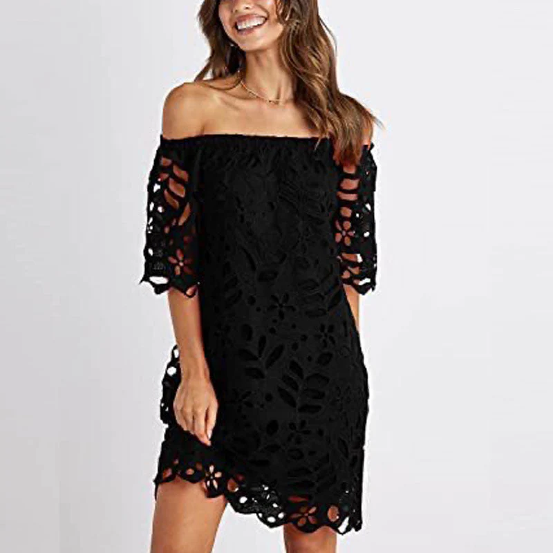 Off Shoulder Floral Lace Flare Short Sleeve Loose Mini Dress